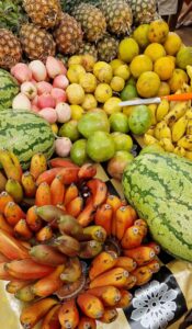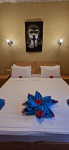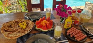 Nous proposons à nos clients un petit-déjeuner à un prix de base, que nos collègues préparent frais selon vos besoins. Entre autres, des fruits tropicaux frais, des jus de fruits, des œufs de diverses manières, des hot dogs, du muesli, des céréales, du pain ou du chapati frais. Que ce soit servi en salle ou en terrasse.